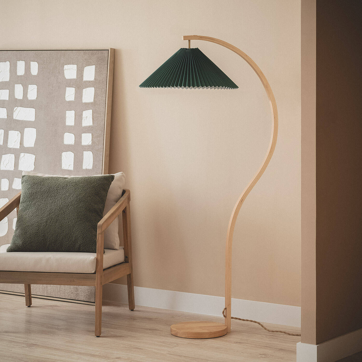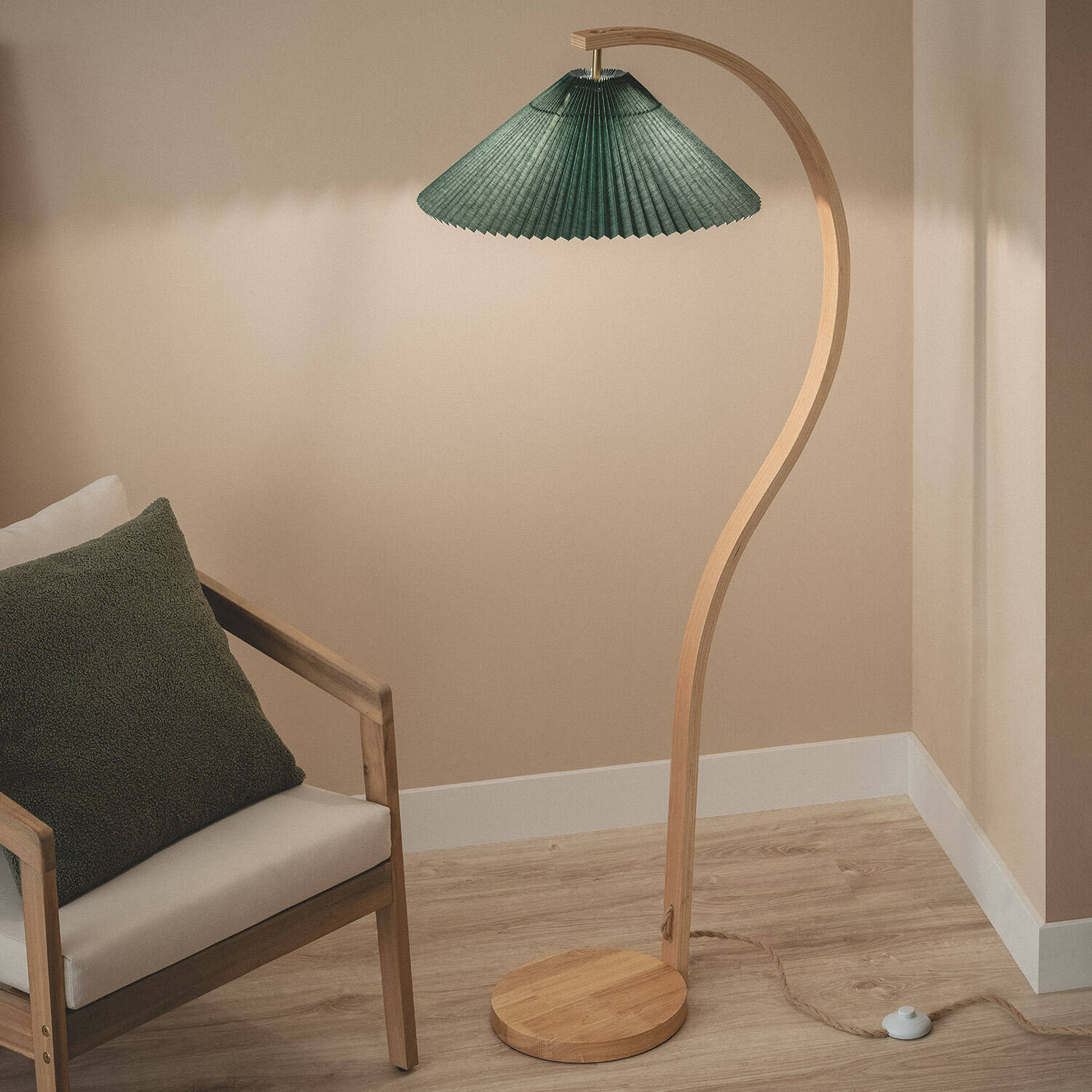 La lámpara de pie Madera Luanda destaca por su diseño elegante y natural, con estructura de madera y pantalla de tela en un atractivo color verde. Su base redonda y el cuerpo curvado aportan un toque moderno y cálido a cualquier estancia interior. Funciona con bombillas E27 de hasta 40W (no incluidas) y cuenta con interruptor integrado para un uso sencillo. Su fabricación con materiales de calidad y certificaciones CE y RoHS garantiza seguridad y durabilidad. Ideal para crear ambientes acogedores en salones, dormitorios o zonas de lectura, esta lámpara combina funcionalidad y estilo, aportando una luz ambiental suave que realza la decoración con un toque natural y contemporáneo. Incluye garantía de 3 años.