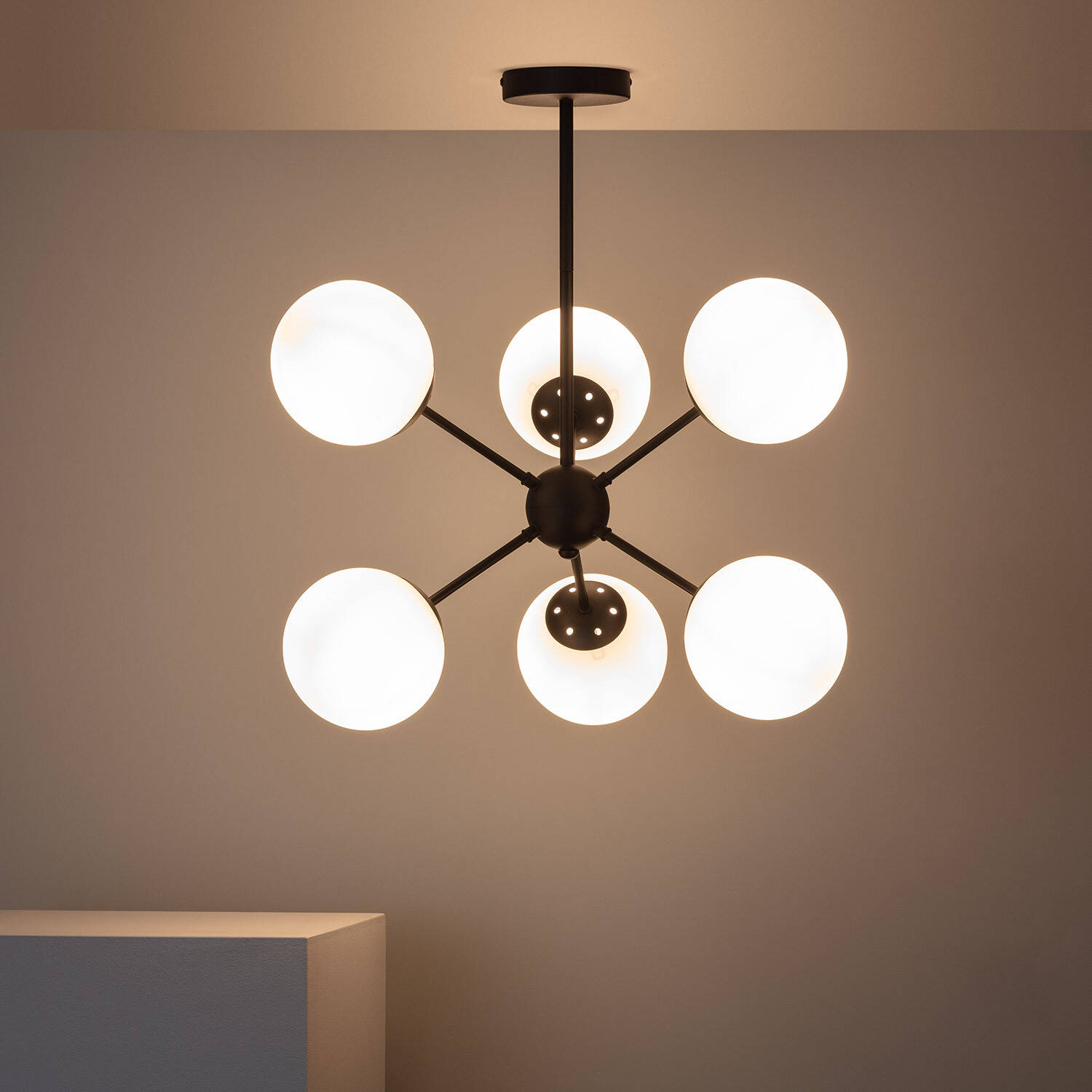 La lámpara de techo Balts Big combina un diseño moderno y elegante con funcionalidad. Fabricada en metal negro y cristal opal, cuenta con seis puntos de luz que aportan una iluminación ambiental suave y homogénea, ideal para salones o comedores. Su estructura resistente permite una instalación en superficie, adaptándose a interiores con temperaturas entre -20 °C y 40 °C. Utiliza bombillas con casquillo E27 (no incluidas), ofreciendo versatilidad para elegir la potencia y tipo de luz deseada. Con certificaciones CE, RoHS y UKCA, garantiza seguridad y calidad. Su acabado minimalista y la combinación de materiales hacen de esta lámpara un elemento decorativo que aporta estilo y calidez a cualquier espacio. Incluye 3 años de garantía.