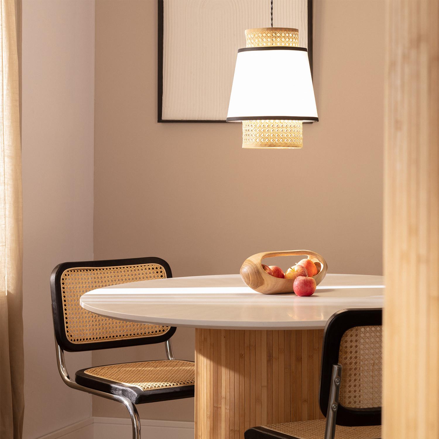 La lámpara colgante Marya combina elegancia y calidez natural con su diseño en ratán y metal. Su pantalla textil blanca con borde negro aporta un toque moderno y sofisticado, mientras que el ratán trenzado añade un aire artesanal y acogedor. Ideal para ambientes interiores, esta lámpara es perfecta para iluminar comedores o salones con estilo único y natural. Compatible con bombillas E27 de hasta 40 W, ofrece funcionalidad y diseño en un solo producto. Su instalación colgante y certificaciones CE, RoHS y UKCA garantizan calidad y seguridad. Además, cuenta con una garantía de 3 años, asegurando durabilidad y confianza en tu compra.