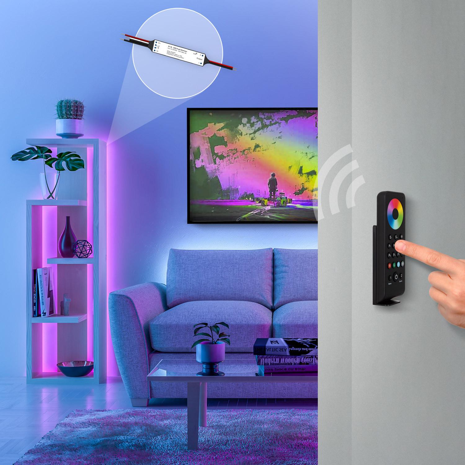 El Mando RF para Reguladores LED RGB / RGBW es el control remoto ideal para gestionar la iluminación LED de interiores con total comodidad. Fabricado en ABS negro, ofrece un diseño ergonómico y compacto que facilita su uso diario. Gracias a su rueda táctil de colores, permite seleccionar y ajustar con precisión la tonalidad y brillo de las tiras LED RGB y RGBW. Dispone de múltiples botones para guardar escenas personalizadas y acceder rápidamente a diferentes modos de iluminación. Cuenta con certificaciones CE, RoHS y UKCA, garantizando calidad y seguridad. Su protección IP20 asegura un uso adecuado en ambientes interiores, y su garantía de 3 años aporta confianza y durabilidad. Un accesorio imprescindible para ambientes modernos y personalizados.