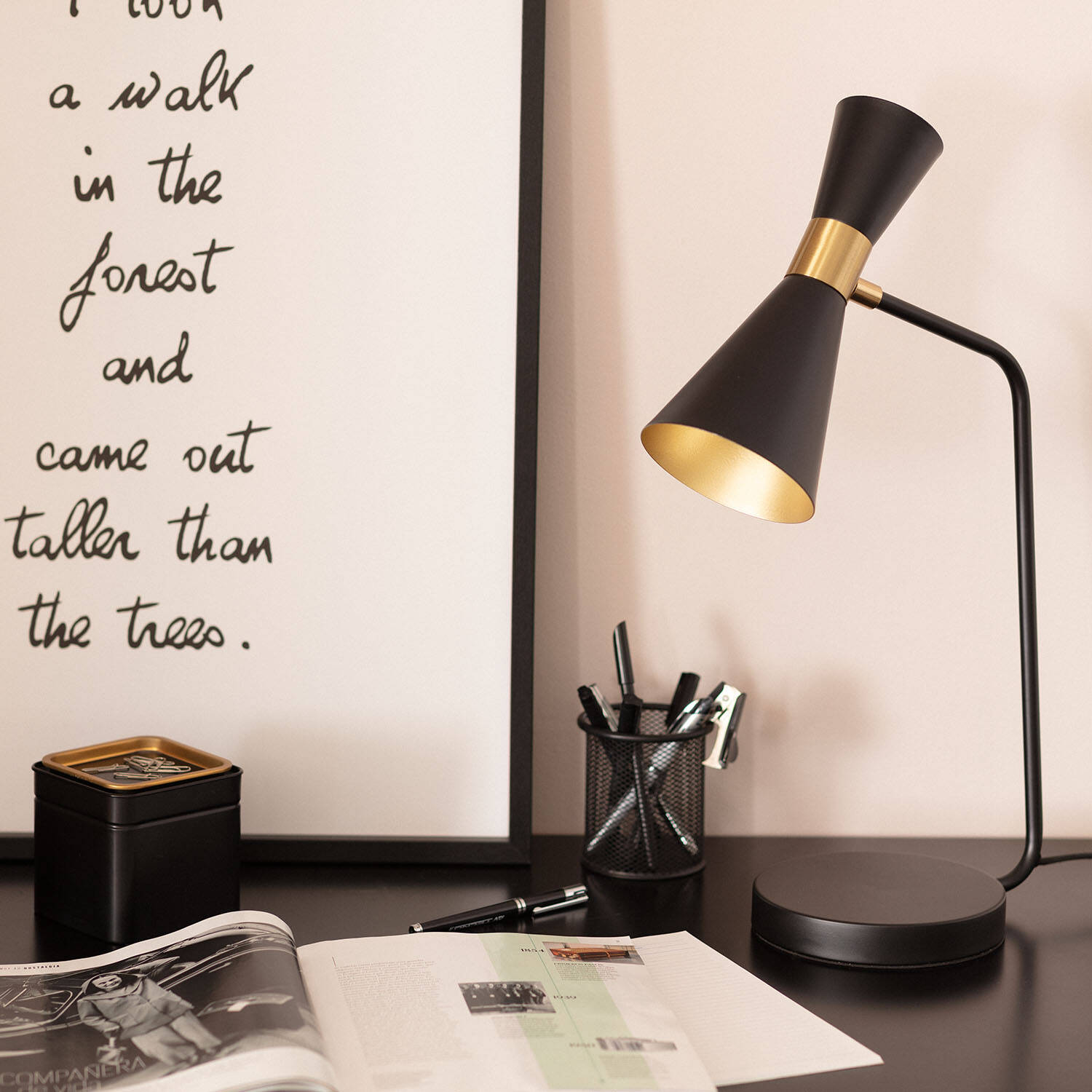 La lámpara flexo de escritorio Jigger combina diseño y funcionalidad en un elegante acabado de acero negro con detalles dorados. Su estructura metálica robusta garantiza durabilidad y estabilidad, ideal para ambientes interiores como oficinas o estudios. Equipada con casquillo E27, permite elegir la bombilla que mejor se adapte a tus necesidades, hasta 20 W de potencia máxima. Su diseño moderno y minimalista aporta un toque sofisticado a cualquier espacio, mientras que el interruptor integrado facilita su uso diario. Certificada con CE, RoHS y UKCA, ofrece seguridad y calidad. Además, soporta temperaturas de trabajo entre -20 °C y 50 °C, asegurando un rendimiento fiable en distintas condiciones. Incluye garantía de 3 años para tu tranquilidad.