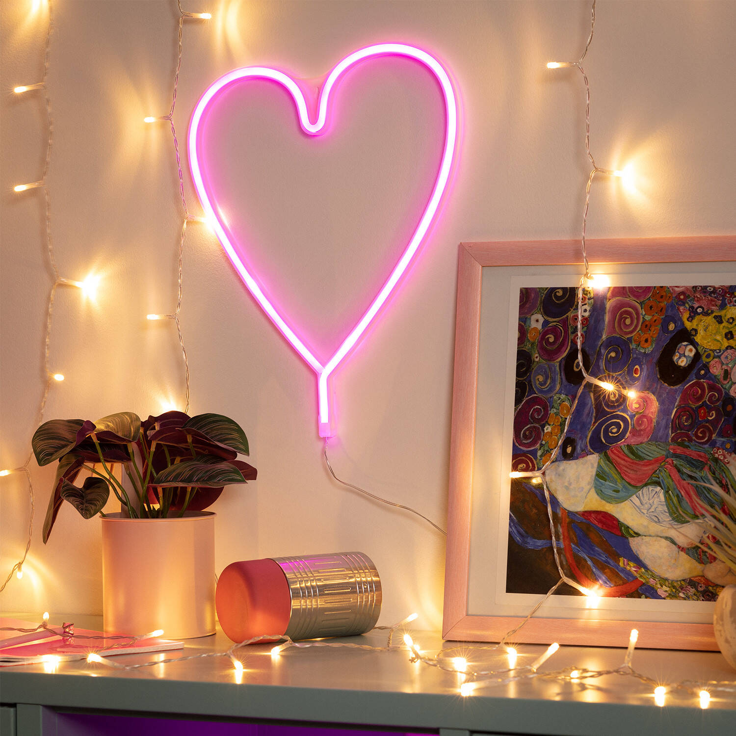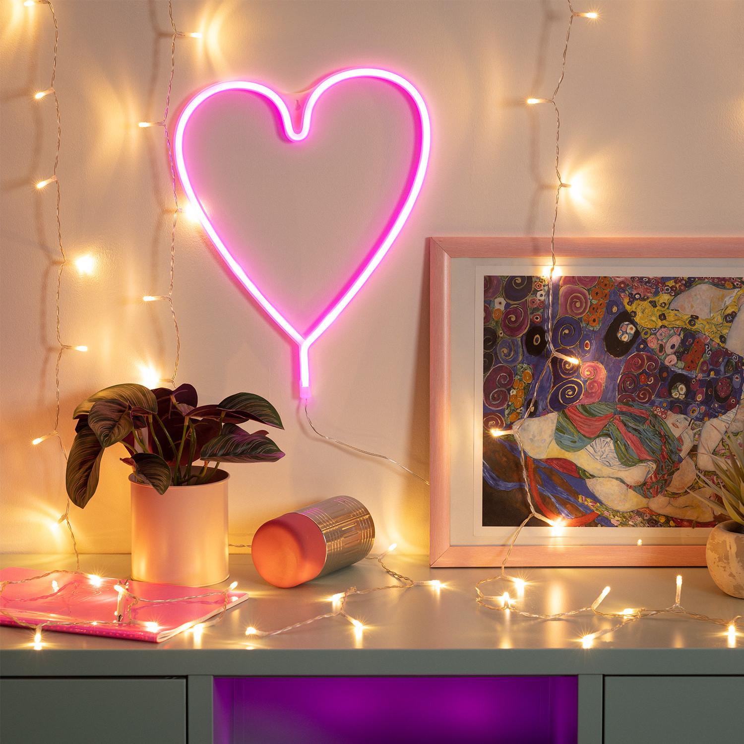 Ilumina tus espacios con el Neón LED Heart con batería, una luz decorativa en forma de corazón que aporta un toque moderno y romántico. Su luz rosa suave crea un ambiente acogedor ideal para interiores, perfecto para dormitorios, salones o rincones especiales. Fabricado en materiales resistentes como PC y PVC, soporta temperaturas de -20 °C a 50 °C, garantizando durabilidad y seguridad con certificaciones CE, RoHS y UKCA. Funciona con pilas (no incluidas), lo que facilita su colocación sin cables. Con protección IP20 y una garantía de 3 años, este neón es una opción práctica y estilosa para decorar con personalidad y calidez cualquier estancia.