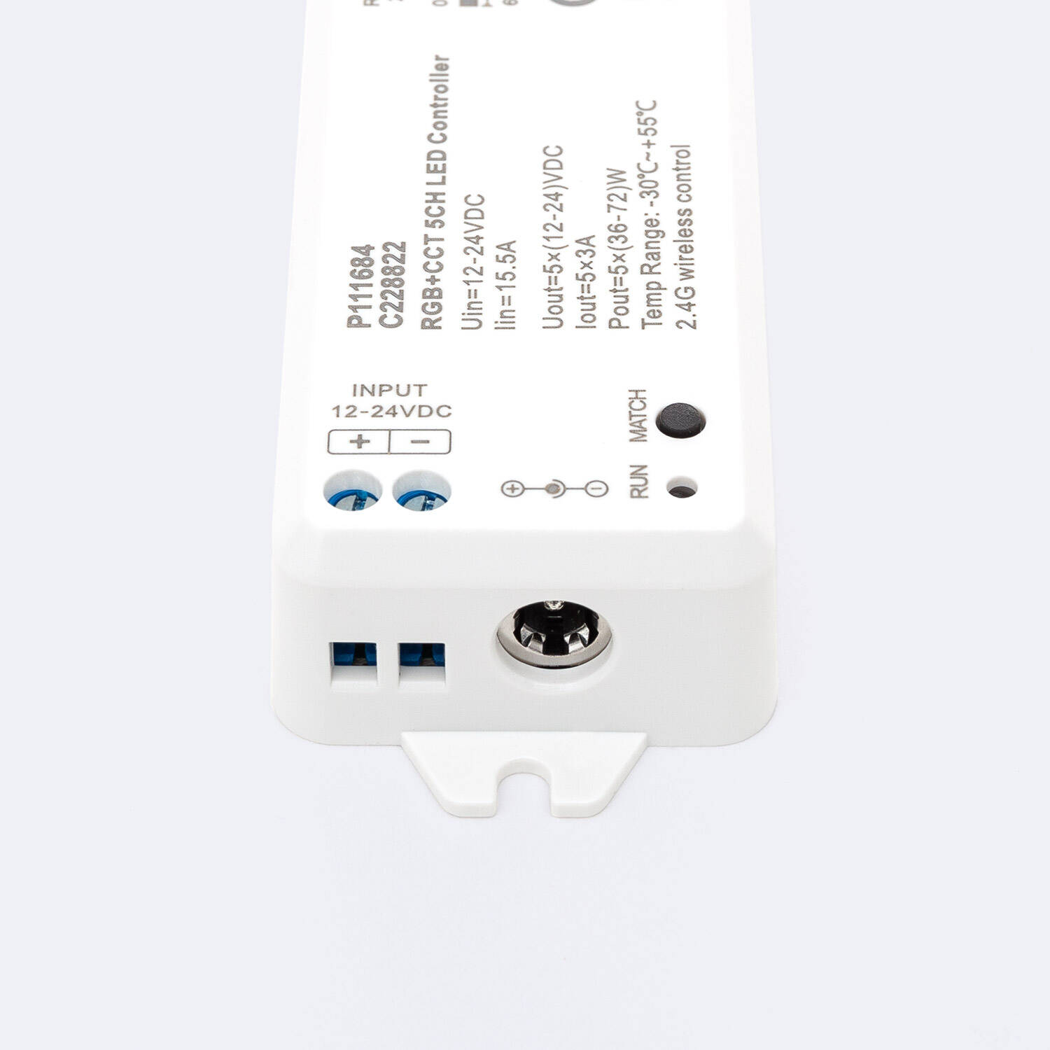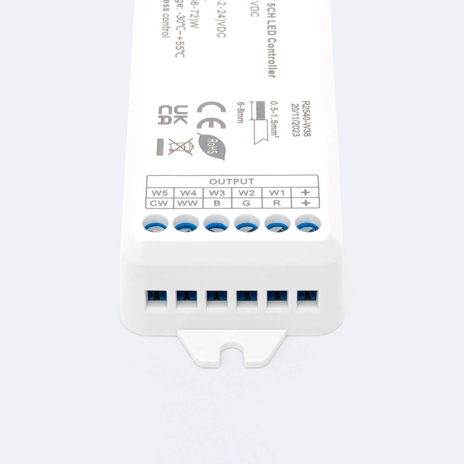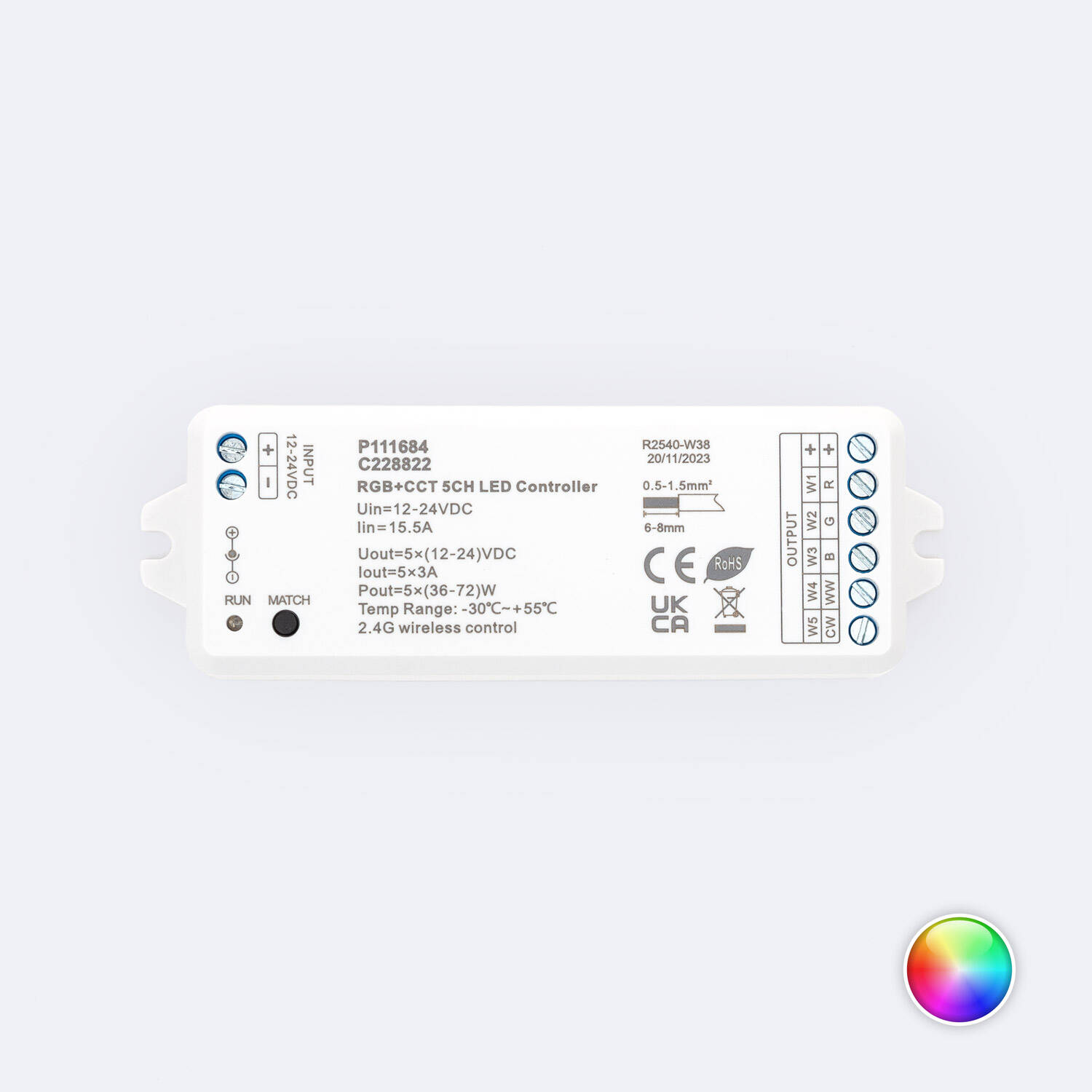 Este controlador regulador LED de 12/24V DC está diseñado para tiras LED RGBWW, ofreciendo una potencia máxima de 72W y una corriente de salida de hasta 3A por canal. Compatible con mando RF, permite un control inalámbrico cómodo y preciso de la iluminación, ideal para ambientes interiores. Su rango de temperatura de trabajo, desde -30 °C hasta 50 °C, garantiza un rendimiento fiable en diversas condiciones. Cuenta con certificaciones CE, RoHS y UKCA, asegurando calidad y seguridad. Su diseño compacto y protección IP20 facilitan la instalación y uso en espacios domésticos o comerciales, con una garantía de 5 años que respalda su durabilidad y eficacia. Perfecto para crear ambientes personalizados con luz RGB y blanco cálido.
