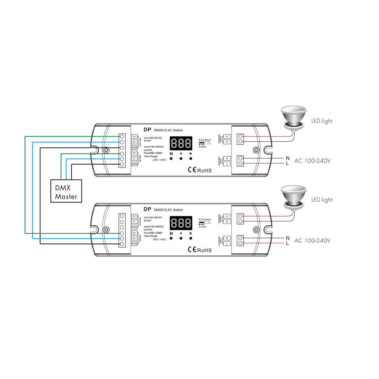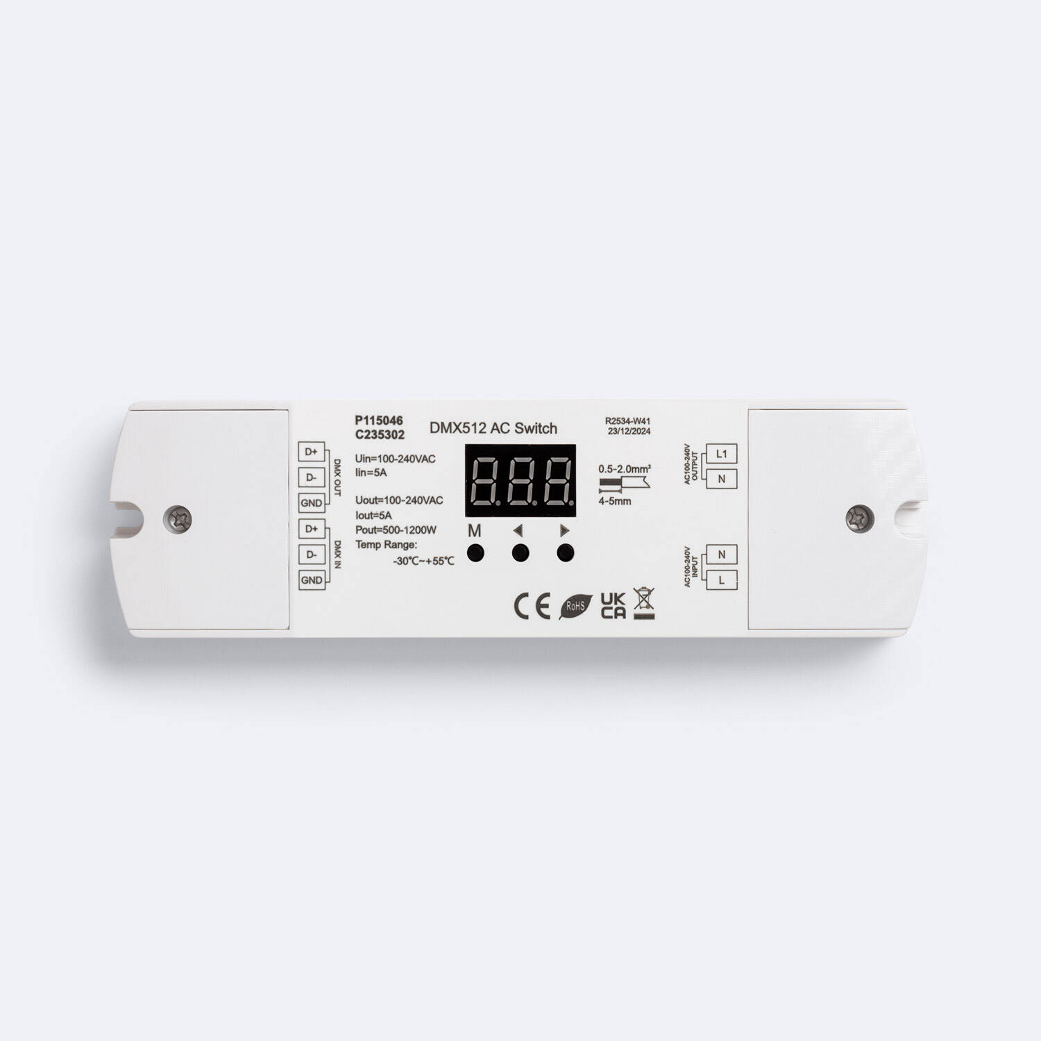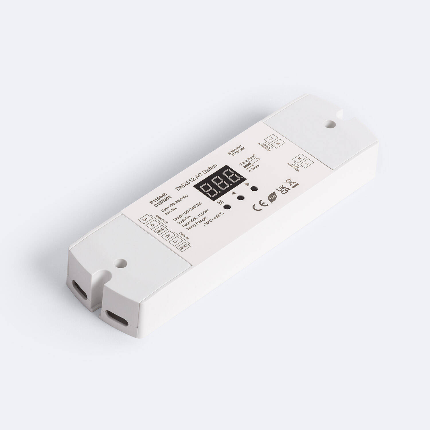 El interruptor 220VAC con señal DMX512 es un dispositivo compacto y eficiente diseñado para controlar cargas eléctricas de hasta 1200 W mediante protocolo DMX512. Ideal para aplicaciones interiores, soporta un rango de temperatura ambiente desde -30 °C hasta 65 °C, garantizando un funcionamiento fiable en diversas condiciones. Con una corriente máxima de salida de 5 amperios y tensión de 220-240V AC, ofrece seguridad y estabilidad, respaldado por certificaciones CE, EMC, LVD y RoHS. Su diseño en color blanco y protección IP20 facilita su integración en instalaciones profesionales. Además, cuenta con una garantía de 3 años, asegurando durabilidad y confianza en su rendimiento para el control preciso de sistemas de iluminación y otros equipos eléctricos.