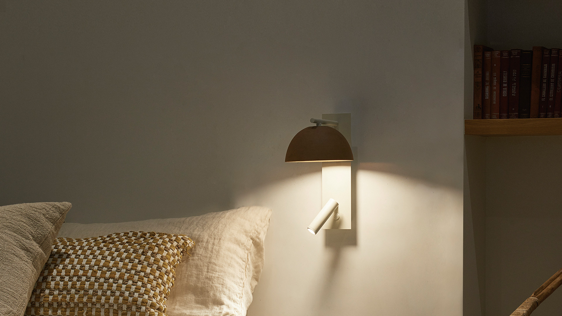 Esta nueva versión vertical con lector del aplique Absis se adapta perfectamente como lámpara de cabecera creando un ambiente relajado. La pantalla de cerámica hecha a mano, da un toque natural y de calidez al entorno.