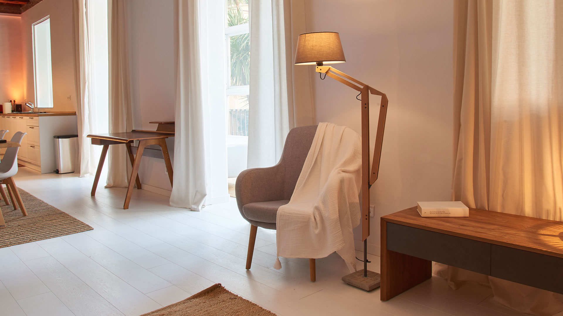 Thea es una lámpara giratoria con brazo oscilante que puede regular su altura de manera eficiente gracias al contrapeso asistido por un mecanismo de fricción. Se trata de una lámpara de gran equilibrio estético entre sus materiales sostenibles y muy dinámica gracias a su geometría. La estructura y la base son de madera, cemento y hierro. La madera en el cuerpo aporta calidez y el panot “flor de Barcelona”, identitario de la ciudad donde se ha diseñado y fabrica esta lámpara, da peso y estabilidad a la base.